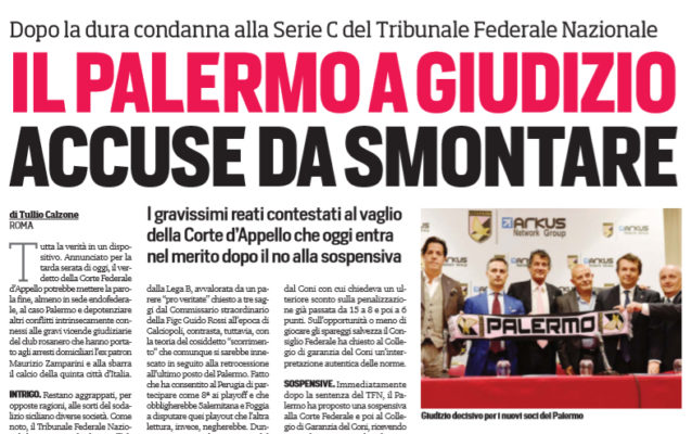 L’edizione odierna de “Il Corriere dello Sport” ha deciso di parlare dell’udienza che si terrà oggi a Roma in merito al ricorso presentato dal Palermo per ribaltare la sentenza del Tribunale federale nazionale. Ecco un estratto dell’articolo: Tutta la verità in un dispositivo. Annunciato per la tarda serata di oggi, il verdetto della Corte Federale d’Appello potrebbe mettere la parola Àne, almeno in sede endofederale, al caso Palermo e depotenziare altri conÁitti intrinsecamente connessi alle gravi vicende giudiziarie del club rosanero che hanno portato agli arresti domiciliari l’ex patron Maurizio Zamparini e alla sbarra il calcio della quinta città d’Italia.