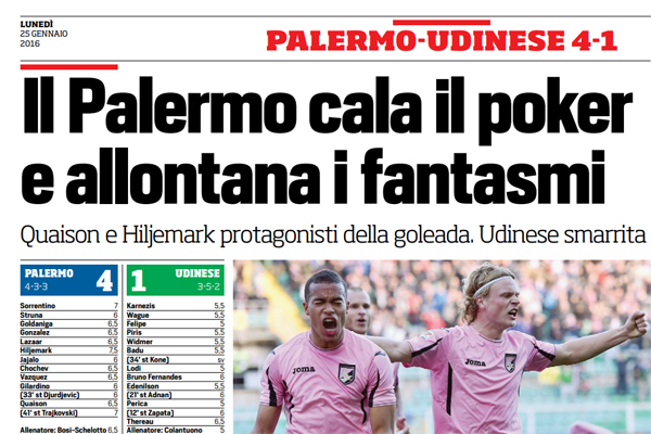 “Bravissimo nel risollevarsi ogni qual volta sembra al tappeto, il Palermo trova un pomeriggio scintillante e di colpo si toglie da una bruttissima classifica, scavalcando due squadre e raggiungendo proprio l’Udinese che a sua volta entra in piena crisi. Colantuono è in bilico, per adesso la squadra è andata in ritiro, ma Pozzo sta sondando la disponibilità di altri tecnici (Mazzarri?) per dare una sterzata ad una squadra che ha perso tre volte di fila prendendo 10 gol in 270′. Effetto Schelotto? Troppo presto e troppo semplice dire che la riscossa rosanero nasce dalle indicazioni del nuovo allenatore argentino, andato in panchina come dirigente accompagnatore ma silenzioso (per obbligo) per l’intero match. Di 4-3-3 si può parlare solo sulla carta perché Vazquez non ha giocato certo da esterno destro ma si è spostato in cerca della palla per tutto l’arco della gara. Ha funzionato invece la mossa Quaison, non solo per il gran gol che ha sbloccato il match, il primo di Robin al Barbera in campionato, ma perché lo svedese ha costituito una variazione tattica efficace, che ha permesso di sviluppare meglio il gioco sulla corsia mancina. Più che le attente indicazioni di Barros Schelotto (in tribuna presente anche Mijatovic, probabile dirigente da giugno), la vittoria premia la ventata di personalità mostrata da ragazzi che fin qua erano stati piuttosto discontinui in materia. Ieri invece il Palermo si è sbattuto in ogni angolo del campo, ha superato senza traumi (occasione fallita da Thereau sullo 0-0) la prima mezz’ora di comprensibile timore e dopo il vantaggio è apparso sollevato tanto da effettuare giocate brillanti che potevano produrre anche più reti delle 4 messe a segno. Lo ha aiutato la leziosità di un’Udinese che forse pensava di essere già fuori dalla lotta salvezza e ora ci ripiomba con entrambi i piedi. Prodezze svedesi. Sull’avvio del match ha pesato il fatto che entrambe venissero da una batosta per 0-4 nel turno precedente (l’Udinese con la Juve, il Palermo col Genoa). Schelotto ha scelto la continuità anche nella formazione, tenendo il nuovo acquisto Cristante in panchina e rispolverando Struna in difesa e Jajalo play. Il Palermo sembrava ibrido, l’Udinese rispondeva con geometrie pulite ma inconsistenti, per poi venire improvvisamente travolto da un’accelerazione dell’avversario. Nel giro di 10′ Gilardino si divorava due occasioni clamorose, ma poi con un gran filtrante favoriva l’inserimento di Hiljemark che di tacco liberava il sopraggiungente Quaison. Gran gol, replicato ad inizio ripresa dagli stessi protagonisti a parti invertite. Prima Sorrentino salvava di piede su Widmer, poi sul contropiede che ne scaturiva Vazquez liberava Quaison e sul suo centro Hiljemark raddoppiava (di coscia!) da distanza ravvicinata. Partita eccellente in tutte e due le fasi del biondo numero 10, giunto al quarto gol stagionale. L’Udinese cominciava a perdere le distanze, non era fortunata in avanti (intervento dubbio di Gonzalez su Badu ma fuori area, gran parata ancora di Sorrentino su Thereau), ma sbracava dietro. Quando Wague deviava sfortunatamente una conclusione da lontanissimo di Lazaar, autore del 3-0, si capiva che la giornata era compromessa. La replica di Trajkovski. Sorrentino proseguiva il suo show fermando Badu e soprattutto Felipe con interventi incredibili, ma il Palermo concedeva un gol evitabile su calcio d’angolo (Thereau di testa dall’aera piccola). L’Udinese però aveva perso ogni equilibrio e ai rosa si aprivano invitanti praterie: Djurdjevic, appena entrato, non ne approfittava sciupando un gol fatto, invece Trajkovski al primo pallone toccato replicava il gol segnato un mese fa al Frosinone, con una deliziosa parabola a girare dal vertice sinistro dell’area. Schelotto, sempre in attesa del patentino, potrà lavorare adesso con meno pressione addosso; Colantuono deve riaccendere una luce che improvvisamente nei friulani si è spenta”. Questa l’analisi condotta da “Il Corriere dello Sport” in merito al match di ieri vinto dai rosa contro l’Udinese.