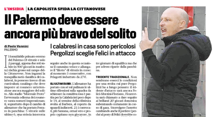 L’edizione odierna del “Corriere dello Sport” parla di un Palermo che dovrà essere ancora più bravo. Oggi i rosanero affronteranno la Cittanovese, e la metà classifica dei calabresi non deve ingannare il tecnico Pergolizzi. Dopo il cambio di allenatore, tra i calabresi, sono arrivate 5 vittorie sulle ultime 6, interrotte dal pari contro il Corigliano. L’ultima sconfitta interna dei giallorossi risale a tre mesi e mezzo fa e su questo campo hanno perso anche Savoia e FC Messina.