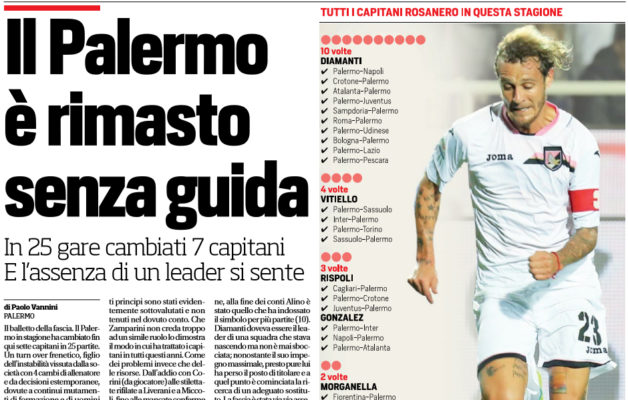 “Il balletto della fascia. Il Palermo in stagione ha cambiato fin qui sette capitani in 25 partite. Un turn over frenetico, figlio dell’instabilità vissuta dalla società con 4 cambi di allenatore e da decisioni estemporanee, dovute a continui mutamenti di formazione e di uomini chiave. Prima Vitiello, poi Diamanti, quindi Rispoli o Gazzi quando i primi due sono stati di fatto messi in panchina, ancora Morganella per anzianità di servizio (è arrivato al Palermo nel 2009) e poi Andelkovic fino a Gonzalez, che sembra il designato in questo periodo. In sua assenza, però, ritocca di nuovo a Rispoli, che ha indossato la fascia venerdì allo Juventus Stadium. Una situazione che fotografa in maniera precisa la convulsa stagione rosanero. Un capitano non dovrebbe essere soltanto il calciatore che va a discutere con l’arbitro durante la partita, ma un punto di riferimento in campo e fuori. Un elemento dotato di leadership e carisma, che susciti rispetto e fiducia da tecnico e spogliatoio ed anche, all’occorrenza, di farsi sentire e rappresentare ad ogni livello le esigenze di un gruppo. Alternarne 7 diversi nel corso della stagione (e ancora il campionato non è finito) non è normale e chissà se anche questo non incida sulla carenza di personalità che a più riprese mostra la squadra. Ma nel Palermo certi principi sono stati evidentemente sottovalutati e non tenuti nel dovuto conto. Che Zamparini non creda troppo ad un simile ruolo lo dimostra il modo in cui ha trattato i capitani in tutti questi anni. Come dei problemi invece che delle risorse. Dall’addio con Corini (da giocatore) alle stilettate rifilate a Liverani e a Miccoli, fino alle mancate conferme di elementi che avrebbero fatto comodo non solo sul piano tecnico ma proprio per la loro capacità di legare l’ambiente. L’ultimo esempio clamoroso è quello di Stefano Sorrentino, cui non è stato rinnovato il contratto la scorsa estate, così come in passato era capitato a tanti altri suoi predecessori di “fascia”.