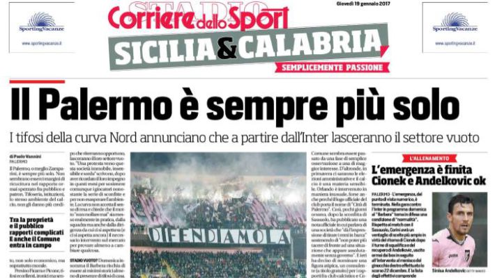 Il Palermo, o meglio Zamparini, è sempre più solo. Dopo l’ironia di Ficarra e Picone contro il patron friulano, adesso anche gli ultras della Curva Nord Superiore hanno deciso di disertare lo stadio. Il gruppo di tifosi che era stato più vicino alla squadra e anche al presidente è arrivata al limite e lo ha annunciato ieri attraverso un comunicato. La curva si aspetta di più dalla squadra ma anche dalla dirigenza. Questo quanto si legge nell’edizione odierna de “Il Corriere dello Sport”.