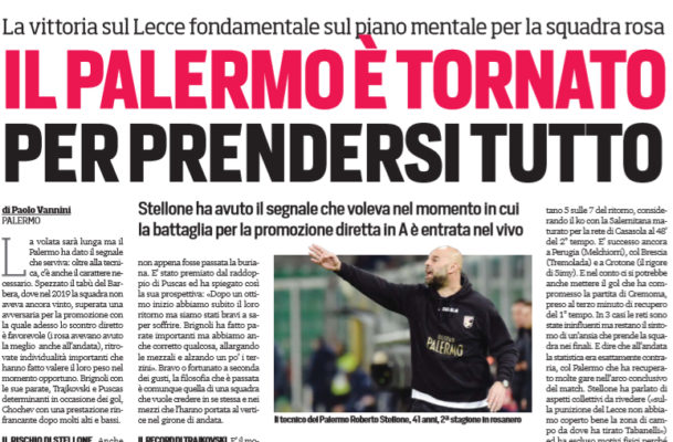 Dopo aver spezzato il tabù del Barbera, dove il Palermo non aveva ancora vinto in questo 2019, adesso i rosanero possono ricominciare a correre per la. volata verso la serie A. Non sarà facile, la strada sarà lunga, ma contro il Lecce – scrive l’edizione odierna de “Il Corriere dello Sport” – è arrivato il segnale che serviva. Merito dei giocatori scesi in campo e anche del tecnico, che nonostante l’assetto tattico del Lecce ha deciso di non cambiare nulla. Scelta premiata dal raddoppio di Puscas, seguito al gol iniziale di Trajkovski. E proprio il numero 10 rosanero ha stabilito due nuovi primati contro il Lecce: 5 gol stagionali e 9 assist. Adesso dovrà trovare continuità. Da rivedere i minuti finali di gioco, nei quali il Palermo subisce troppi gol: è successo nelle ultime tre partite e non solo.
