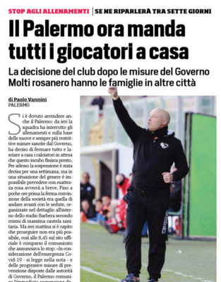 Continua l’emergenza Coronavirus in Italia e il mondo dello sport è praticamente fermo. Ieri anche il Palermo che era rimasta l’unica squadra di Serie D ad allenarsi, ha dovuto sospendere le sedute di lavoro. L’edizione odierna del “Corriere dello Sport” fa il punto della situazione in casa rosanero, gli uomini di Pergolizzi staranno a casa per una settimana. Ieri il comunicato: «In considerazione dell’emergenza Covid-19 – si legge nella nota – e delle progressive misure di prevenzione disposte dalle autorità di Governo, il Palermo comunica l’immediata sospensione degli allenamenti per 7 giorni, salvo successive indicazioni. Ai calciatori è stato raccomandato di restare presso il proprio domicilio in stretto contatto con lo staff sanitario, evitando rientri presso le residenze e contatti sociali non strettamente necessari».