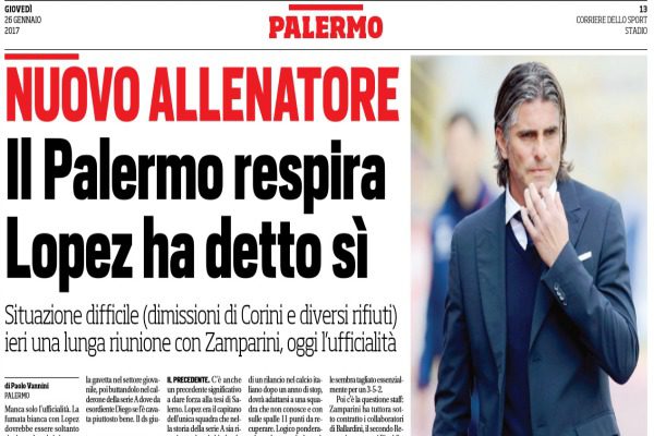 Corriere dello Sport: “Il Palermo respira, Lopez ha detto sì. Situazione difficile, ieri una lunga riunione con Zamparini. Oggi…”