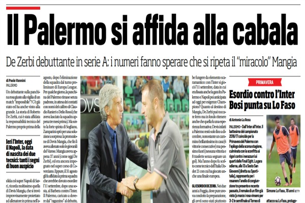 Corriere dello Sport: “Il Palermo si affida alla cabala. De Zerbi debuttante in serie A: i numeri fanno sperare che si ripeta il “miracolo” Mangia”