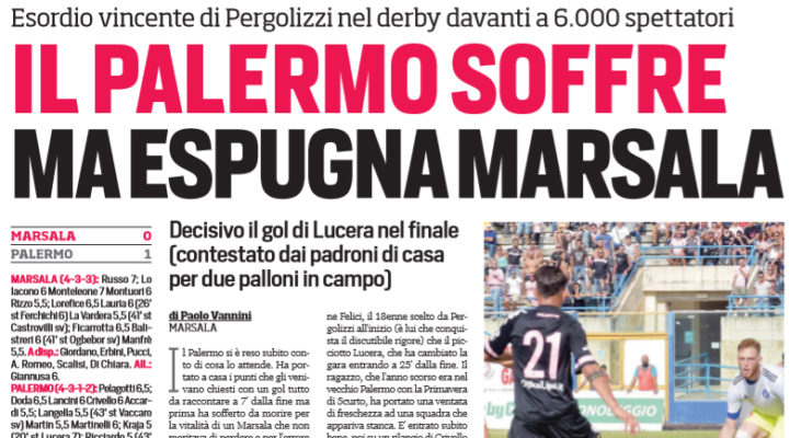 L’edizione odierna del “Corriere dello Sport” si sofferma sulla vittoria del Palermo a Marsala. La squadra rosanero ha faticato a costruire una manovra lineare con un Ricciardo che ha steccato la partita. Sono piaciuti i giovani Felici e Lucera. Il ragazzo del vecchio Palermo ha portato una ventata di freschezza ad una squadra stanca, segnando nonostante un secondo pallone gettato dai raccattapalle. L’arbitro ha convalidato e l’episodio ha tenuto banco nel dopo partita.