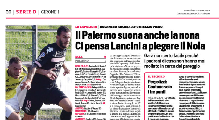 L’edizione odierna del “Corriere dello Sport” esalta la vittoria del Palermo su Nola. Nona sinfonia suonata con una prestazione attenda e determinata. Decisiva la rete di Lancini che risolve una partita complessa. Il Palermo non si limita a gestire il gioco e nella ripresa è proprio il centrale a deviare la palla in rete a fil di palo. In festa gli oltre 450 tifosi al seguito del Palermo, ma il Nola prova a guastare la festa cercando il pareggio. La gara diventa molto nervosa nelle fasi finali e a farne le spese è Sforzini, uscito anzitempo per una botta al naso.