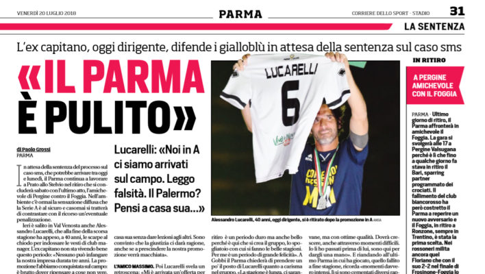 “In attesa della sentenza del processo sul caso sms, che potrebbe arrivare tra oggi e lunedì, il Parma continua a lavorare a Prato allo Stelvio nel ritiro che si concluderà sabato con l’ultimo atto, l’amichevole di Pergine contro il Foggia. Nell’ambiente c’è ormai la sensazione diffusa che la Serie A è al sicuro e casomai si tratterà di contrastare con il ricorso un’eventuale penalizzazione. Ieri è salito in Val Venosta anche Alessandro Lucarelli, che alla fine della scorsa stagione ha appeso, a 40 anni, le scarpe al chiodo per indossare le vesti di club manager. L’ex capitano non sta vivendo bene questo periodo: «Nessuno può infangare la nostra impresa durata tre anni. La promozione l’abbiamo conquistata sul campo: è brutto dover ripensare a cose non vere, che danneggiano la nostra immagine. Siamo con la coscienza pulita, sia come squadra che come società. Affrontiamo il processo perché siamo stati chiamati in causa, ma quello che sta succedendo ha quasi del ridicolo. Il Palermo spinge? Stanno cavalcando l’onda, facendo ogni giorno dichiarazioni sui giornali. Se volevano la promozione dovevano conquistarla sul campo come abbiamo fatto noi. Ma anch’io leggo ogni giorno di loro problemi, per cui forse è meglio che ognuno pensi a casa sua senza dare lezioni agli altri. Sono convinto che la giustizia ci darà ragione, anche se a prescindere la nostra promozione verrà macchiata»”. Questo quanto riportato dall’edizione odierna de “Il Corriere dello Sport”.