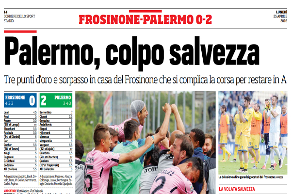 Corriere dello Sport: “Palermo colpo salvezza. Tre punti d’oro e sorpasso Frosinone che si complica la corsa per restare in A”