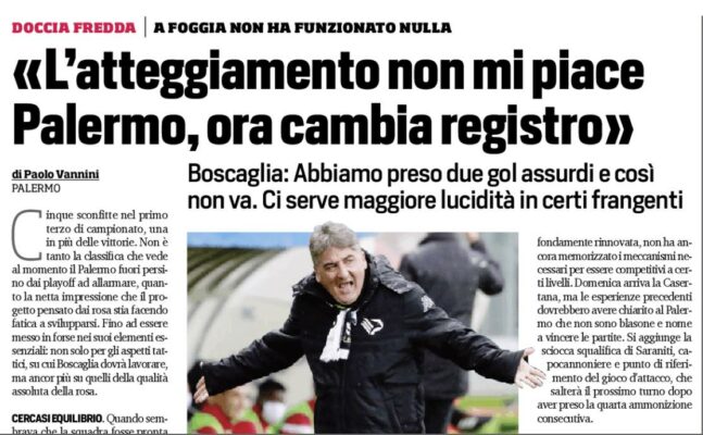 L’edizione odierna del “Corriere dello Sport” si sofferma sul momento del Palermo, riportando le dichiarazioni dell’allenatore Roberto Boscaglia.