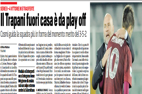 Corriere dello Sport: “Il Trapani fuori casa è da play off, Cosmi guida la squadra più in forma del momento: merito del 3-5-2”