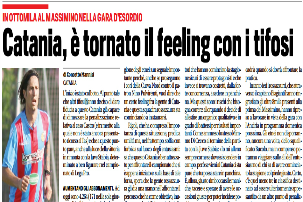 “L’inizio è stato col botto. Al punto tale che altri tifosi hanno deciso di dare fiducia a questo Catania già capace di dimezzare la penalizzazione relativa al caso Castro (e in merito alla quale non è stato ancora presentato ricorso al Tas) e che a questo punto pare, anche alla luce della vittoria in rimonta con la Juve Stabia, determinato a ben figurare nel campionato di Lega Pro. AUMENTANO GLI abbonamenti. Ad oggi sono 4.264 (171 nella sola giornata di ieri) i sostenitori che hanno sottoscritto l’abbonamento per seguire passo dopo passo la nuova stagione degli etnei: un segnale importante perché, anche se proseguono i cori della Curva Nord contro il patron Nino Pulvirenti, vuol dire che un certo feeling fra la gente di Catania e questa squadra rossazzurra sta cominciando a instaurarsi. Rigoli, che ha compreso l’importanza di questa situazione, predica umiltà ma, nel frattempo, soffia con furbizia sul fuoco degli entusiasmi: sa che questo Catania è ben attrezzato per affrontare il campionato che si è appena iniziato e, sulla base di tale forza, spera che la gente rossazzurra gli dia una mano nell’affrontare il percorso che ha come obiettivo, inutile nascondersi, il ritorno in Serie B. Certo, ci potrebbe essere l’incognita di qualche malumore fra i giocatori che hanno cominciato la stagione sicuri di essere protagonisti e che invece si trovano costretti, dalla forte concorrenza, a sedere in panchina. Ma questi sono i rischi che bisogna correre allorquando si decide di allestire un organico qualitativo e in grado di battersi per risultati importanti. Come ammesso lo stesso Mimmo Di Cecco al termine della partita con la Juve Stabia: «Io mi alleno sempre come se dovessi scendere in campo, però se vieni al Catania ci sta pure che tu possa stare in panchina. E, allora, giusto rimboccarsi le maniche, tacere e sperare di avere le occasioni giuste per poter incidere positivamente nella stagione di questa squadra». Un discorso che in teoria non fa una piega, vediamo cosa accadrà quando si dovrà affrontare la pratica. Intanto ieri i rossazzurri, che attraverso il capitano Biagianti hanno ringraziato gli oltre 8mila presenti alla prima del Massimino, hanno ripreso a lavorare in vista della gara con l’Andria in programma domenica prossima. Gli etnei non disporranno, ancora una volta, dello squalificato Bucolo, ma in compenso potranno viaggiare sulle ali dell’entusiasmo di chi sa di avere cominciato la stagione col piede giusto. Certo, c’è quel meno tre in classifica destinato ad essere ulteriormente appesantito da un altro punto di penalizzazione, ma se si riesce a viaggiare a questi ritmi”. Questo quanto riporta “Il Corriere dello Sport”.