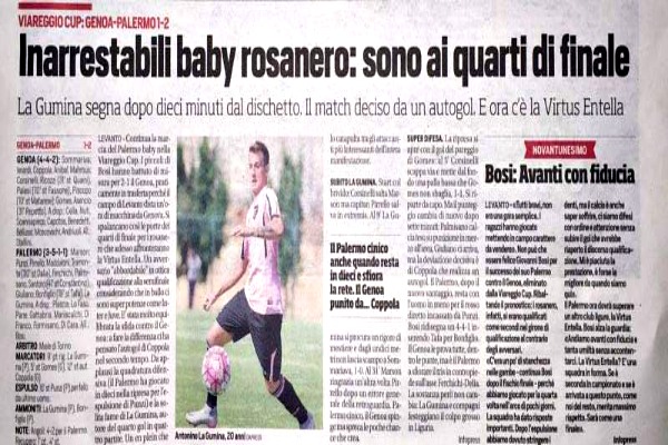 “Continua la marcia del Palermo baby nella Viareggio Cup. I piccoli di Bosi hanno battuto di misura per 2-1 il Genoa, praticamente in trasferta perché il campo dista un’ora di macchina da Genova. Si spalancano così le porte dei quarti di finale per i rosanero che adesso affronteranno l’Entella. Un avversario abbordabile in ottica qualificazione alla semifinale considerando che in ballo ci sono super potenze come Inter e Juve […]”. Questo quanto scrive l’edizione odierna de “Il Corriere dello Sport”.