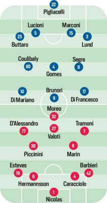 A disp.: 22 Loria, 34 Campani, 3 Leverbe, 9 Gliozzi, 14 Trdan, 16 Nagy, 17 Mlakar, 23 Vignato, 26 Masucci, 28 Arena, 30 De Vitis, 44 Veloso. Indisp.: Beruatto, Barberis, Calabresi, Torregrossa, M. Tramoni, Tourè, Jureskin. Squal.: Canestrelli. Diff.: L. Tramoni e Leverbe. Ultime: Moreo-Gliozzi in attacco.