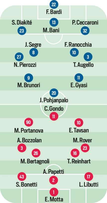 Palermo: Bardi; Diakité, Bani, Ceccaroni; N. Pierozzi, Segre, Ranocchia, Augello; Gyasi, Brunori; Pohjanpalo.