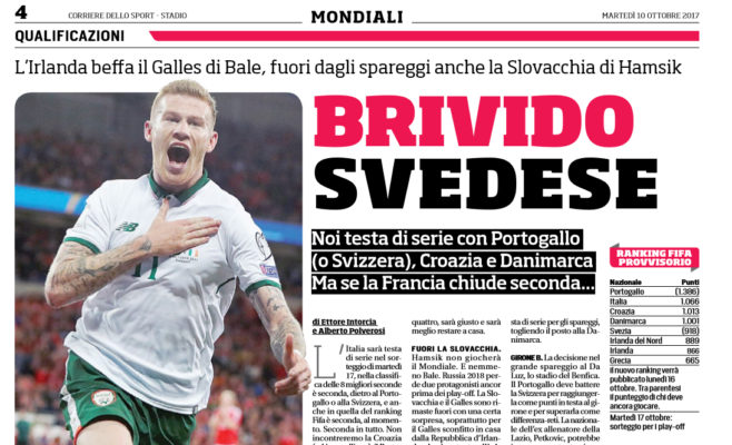 “L’Italia sarà testa di serie nel sorteggio di martedì 17, nella classifica delle 8 migliori seconde è seconda, dietro al Portogallo o alla Svizzera, e anche in quella del ranking Fifa è seconda, al momento. Seconda in tutto. Non incontreremo la Croazia (ed è un sollievo), il Portogallo di Ronaldo campione d’Europa (altro sollievo) o la Svizzera, insieme a noi nel gruppo delle prime 4 come da ranking Fifa, che verrà ufficializzato lunedì prossimo, ma che abbiamo calcolato in anticipo. Per ora in questo gruppetto d’elité c’è anche la Danimarca, che però può retrocedere nell’altro schieramento solo se la Svezia supera la Francia nel girone. In questo caso, sarà la nazionale di Deschamps, scendendo al 2° posto del suo gruppo, a prendere un posto da testa di serie. L’Italia nell’urna di Zurigo potrà pescare la Svezia (o eventualmente la Danimarca), l’Irlanda del Nord, la Repubblica d’Irlanda e la Grecia. Tutte alla nostra portata, anche se la Macedonia e la stessa gara sofferta con l’Albania non ci rendono molto ottimisti. Ma se non battiamo una di quelle quattro, sarà giusto e sarà meglio restare a casa. FUORI LA SLOVACCHIA. Hamsik non giocherà il Mondiale. E nemmeno Bale. Russia 2018 perde due protagonisti ancor prima dei play-off. La Slovacchia e il Galles sono rimaste fuori con una certa sorpresa, soprattutto per il Galles sconfitto in casa dalla Repubblica d’Irlanda che è entrata all’ultimo istante nel gruppo delle otto migliori seconde. Ne manca una sola e verrà scelta stasera a Lisbona nella sfida fra Portogallo e Svizzera. GIRONE A. Oggi si chiuderà appunto la fase di qualificazione e alcuni verdetti devono essere ancora emessi. Se la Francia non batte la Bielorussia (sarebbe un’impresa al contrario, ma i bleus hanno già pareggiato 0-0 in casa col Lussemburgo…), la Svezia li può sorpassare al 1° posto battendo l’Olanda. La quale Olanda sogna una vittoria leggendaria con 7 gol di scarto sulla Svezia per strapparle il 2° posto. Come visto, se i francesi arrivano secondi, prendono la qualifica di testa di serie per gli spareggi, togliendo il posto alla Danimarca. GIRONE B. La decisione nel grande spareggio al Da Luz, lo stadio del Benfica. Il Portogallo deve battere la Svizzera per raggiungerla come punti in testa al girone e per superarla come differenza-reti. La nazionale dell’ex allenatore della Lazio, Petkovic, potrebbe invece accontentarsi anche del pareggio. Chi arriva seconda è sicura di entrare nel gruppo delle migliori 8 come testa di serie. GIRONE H. Belgio qualificato da tempo e Grecia seconda, a meno di una mancata vittoria domani sera su Gibilterra, che finora ha sempre perso, e nello stesso tempo successo in Estonia della Bosnia, ora praticamente fuori. La Grecia è certa di far parte del gruppetto delle migliori seconde, la Slovacchia ha 12 punti (uno in meno) e non può più raggiungerla. In base al ranking Fifa, la Grecia è all’ultimo posto tra le otto ai play-off, ma a Manolas e compagni va bene anche così”. Questo quanto riportato dall’edizione odierna de “Il Corriere dello Sport”.