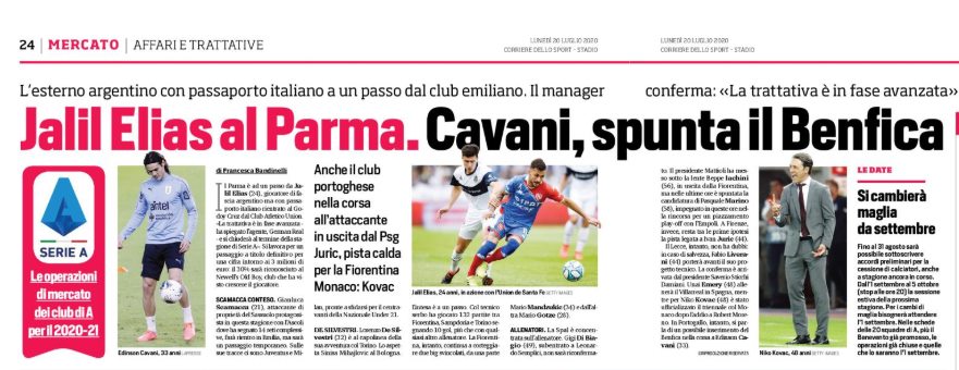 L’edizione odierna del “Corriere dello Sport” parla di Jalil Elias che sarebbe vicinissimo al Parma per circa 3 milioni di euro. In Portogallo invece, si parla di un possibile inserimento del Benfica nella corsa a Edinson Cavani.