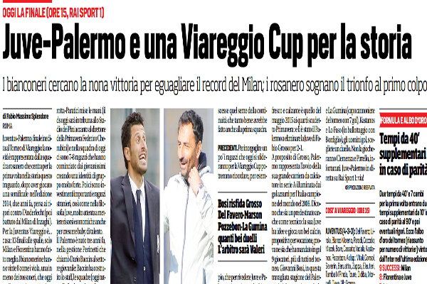 Corriere dello Sport: “Juve-Palermo e una Viareggio Cup per la storia. I bianconeri cercano la nona vittoria; i rosa sognano il trionfo al primo colpo”