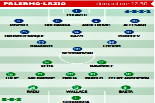 Corriere dello Sport: la probabile formazione di Palermo-Lazio (FOTO) Segui Ilovepalermocalcio su Google News Redazione Ilovepalermocalcio Novembre 26, 2016 Ecco la probabile formazione, proposta nell’edizione odierna de “Il Corriere dello Sport”, della partita di domenica delle 12.30 Palermo-Lazio: