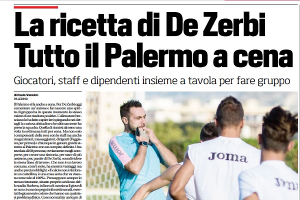 “Il Palermo si fa anche a cena. Per De Zerbi oggi cementare un’unione e far nascere uno spirito di gruppo ha in questo momento lo stesso valore di un risultato positivo. L’allenatore bresciano lo ha fatto capire ieri spiegando nei dettagli la curiosa abitudine che ultimamente ha preso la squadra. Quella di riunirsi almeno una volta la settimana tutti per cena. Ma non solo i componenti della rosa con lo staff ma anche magazzinieri, massaggiatori, dirigenti (Faggiano per primo) e chiunque in genere graviti attorno al Palermo con un compito definito. Una tavolata di 60 persone, ovviamente mogli comprese, per creare una sintonia, per stare di più assieme, per, parole di De Zerbi, «condividere la stessa linea di lavoro». Che non è un lavoro comune, com’è noto, ha enormi vantaggi ma anche precisi obblighi: «Il calcio non è timbrare un cartellino, è una cosa seria che va vissuta come tale al 100%». Pressappoco sempre lo stesso ristorante, situato proprio a ridosso dello stadio Barbera, in linea di massima il giovedì se non ci sono impegni infrasettimanali, esentati logicamente coloro che hanno un qualsiasi problema fisico. Cose normali in un team di lavoro, si dirà. Ma sicuramente più significative in uno spogliatoio che ha dovuto subire l’ennesima rivoluzione di uomini al comando. De Zerbi aveva la necessità di inserirsi il più in fretta possibile e anche questi sistemi possono rivelarsi utili, soprattutto in un gruppo giovane e molto variegato per lingua (ci sono stranieri di 15 diverse nazioni) ed abitudini. Comprese quelle alimentari.