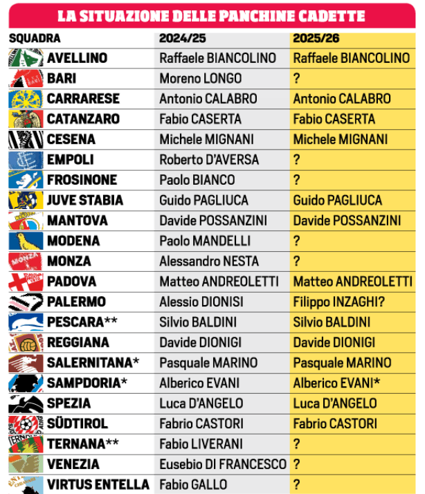 Corriere dello Sport: “La situazione delle panchine cadette”