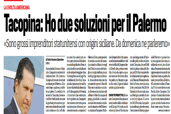 “Erano i primi di marzo e Maurizio Zamparini confermò le indiscrezioni: «Ho chiesto a Tacopina di trovare investitori americani per il Palermo». Due mesi dopo qualcosa potrebbe accadere. E a svelarlo è lo stesso Joe Tacopina, l’avvocato di New York che da otto anni ha gravitato prima attorno per poi entrare dentro il mondo del calcio italiano e che nell’ultimo anno ha cominciato anche a prendersi soddisfazioni personali significative. Bene, in procinto di tornare in Italia nel week end per festeggiare il suo Venezia promosso in Lega Pro, al telefono da New York, Tacopina ha risposto anche sul Palermo: «Sarò in Italia domenica per l’ultima partita del Venezia e mi fermerò due settimane. Avevo parlato con Zamparini che mi aveva esternato questa sua intenzione di trovare persone interessate a comprare il Palermo. E io in questo periodo ho avviato una serie di contatti puntando sul fatto che negli Stati Uniti ci sono molte famiglie con origini siciliane, tra cui molti gruppi imprenditoriali». Sono arrivate risposte che possono far sperare i tifosi del Palermo in un futuro societario diverso senza rischiare salti nel buio? «Direi di sì: un paio di gruppi, più di altri, si sono dimostrati interessati ad analizzare la situazione del Palermo e a valutarne l’acquisto. Parliamo di imprenditori che operano nel ramo immobiliare e dei terreni edificabili. Imprenditori di livello alto, persone serie. Ora c’è solo da capire se questo interesse diventerà altro. Ne parlerò con Maurizio e spero che i miei 15 giorni italiani portino qualche novità». CONTATTI E PROSPETTIVE. Il contatto Zamparini-Tacopina era stato favorito dalla mediazione di Giorgio Perinetti, ora direttore sportivo al Venezia ma con una lunga storia di Palermo alle spalle: anche con Zamparini. Tacopina, che nel 2008 tentò la prima scalata al Bologna, nel 2011 faceva parte della cordata americana capitanata da Thomas DiBenedetto che rilevò la Roma: aveva la carica di vice presidente. Nel 2014 le dimissioni e la seconda scaata al Bologna, stavolta riuscita con Joey Saputo. E a ottobre 2015 il Venezia. Zamparini ha manifestato più volte ormai l’intenzione di disimpegnarsi dal Palermo e questa è stata una stagione da incubo, costellata da esoneri, in cui la vittoria a Frosinone domenica ha rappresentato lo scatto di reni disperato di una squadra che vuole provarci fino all’ultimo. All’orizzonte i siciliani d’America? Può essere davvero così. Parola di Joe Tacopina. Che precisa: «Consideratemi nulla più che un intermediario in questa vicenda: la mia testa e il mio cuore sono a Venezia»”. Questo quanto riporta l’edizione odierna de “Il Corriere dello Sport”.