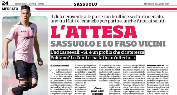 L’edizione odierna del “Corriere dello Sport” riporta delle ultime notizie di calciomercato che riguardano il Sassuolo. In particolare, si parla anche di un possibile approdo in neroverde dell’attaccante rosanero Simone Lo Faso: “Se dipendesse solo dal Sassuolo, il mercato sarebbe chiuso: lo fa intendere chiaramente l’ad Giovanni Carnevali che si ritrova tra l’incudine e il martello perché i procuratori spingono e qualche club non molla, come lo Zenit San Pietroburgo che per Politano è disposto ad andare sopra i 15 milioni più bonus per il cartellino e un quadriennale all’esterno d’attacco. Ieri sera Carnevali, Angelozzi e Bucchi hanno fatto il punto della situazione dopo il pareggio con il Genoa e per il rush finale del mercato. Ballano diverse questioni, dalla trattativa per Matri al Parma a quella per Iemmello al Benevento, anche se l’una escuderà eventualmente l’altra. E’ un problema di spazi e di caratteristiche, tenendo conto che i neroverdi hanno in organico come centravanti anche Scamacca del ’99, considerato un talento purissimo di cui nessuno vuole privarsi.