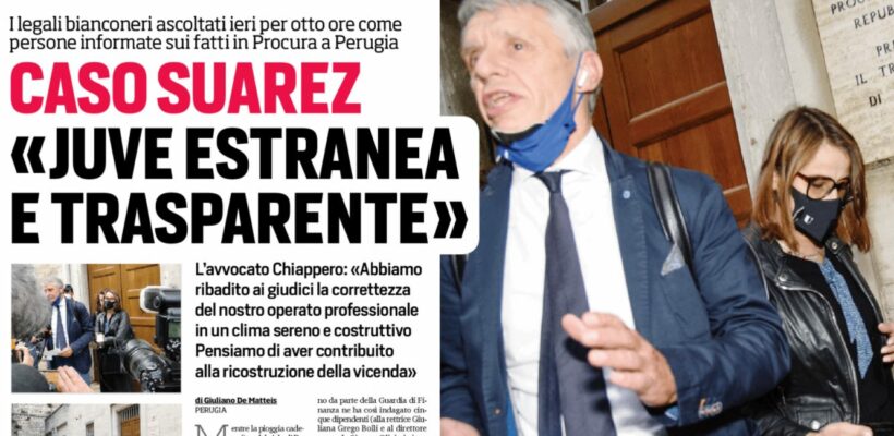 L’edizione odierna del “Corriere dello Sport” si sofferma sul caso Suarez. L’avvocato bianconero Luigi Chiappero e la sua collega Maria Turco sono stati ascoltati otto ore in Procura dai pubblici ministeri Paolo Abbritti e Gianpaolo Mocetti come persone informate sui fatti. «Noi estranei e trasparenti – ha dichiarato Chiappero – La nostra veste di testimoni ci è servita per ribadire la correttezza del nostro operato professionale in un clima assolutamente sereno e costruttivo».