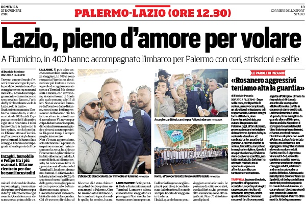 Corriere dello Sport: “Lazio, pieno d’amore per volare a Fiumicino. In 400 hanno accompagnato l’imbarco per Palermo con cori, striscioni e selfie”