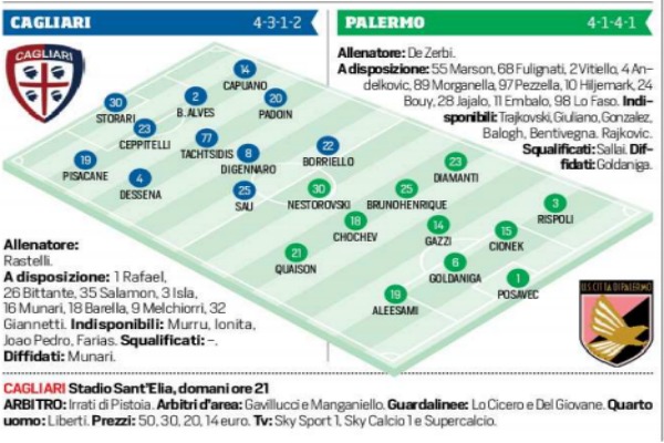 Domani sera alle 21 il Palermo scenderà in campo per affrontare il Cagliari allo stadio “Sant’Elia”. De Zerbi dovrebbe cambiare nuovamente modulo in vista di una sfida cruciale per la classifica. 4-1-4-1 lo schieramento provato ieri in allenamento dall’ex tecnico del Foggia. Ecco in basso la foto delle probabili formazioni dell’edizione odierna de “Il Corriere dello Sport”: