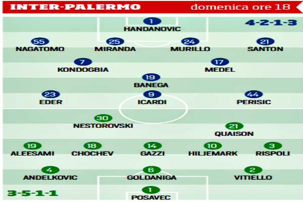 “INTER – D’Ambrosio a parte per un fastidio agli adduttori. Già oggi però dovrebbe tornare in gruppo. A disposizione: 30 Carrizo, 46 Berni, 33 D’Ambrosio, 94 Yao, 13 Ranocchia, 27 Gnoukouri, 5 Felipe Melo, 77 Brozovic, 87 Candreva, 11 Biabiany, 8 Palacio. Allenatore: De Boer. Indisponibili: Ansaldi, Andreolli. Squalificati: -. Diffidati: -. PALERMO – Probabile il cambio di modulo, in difesa Andelkovic per Rajkovic, davanti Nestorovski unica punta. Trajkovski non recupera. A disposizione: 55 Marson, 68 Fulignati, 12 Gonzalez, 15 Cionek, 23 Struna, 97 Pezzella, 28 Jajalo, 11 Embalo, 20 Sallai, 22 Balogh, 27 Bentivegna, 98 Lo Faso. Allenatore: Ballardini. Indisponibili: Trajkovski. Morganella. Squalificati: Morganella, Rajkovic. Diffidati”. Questo quanto si legge sull’edizione odierna de “Il Corriere dello Sport”.