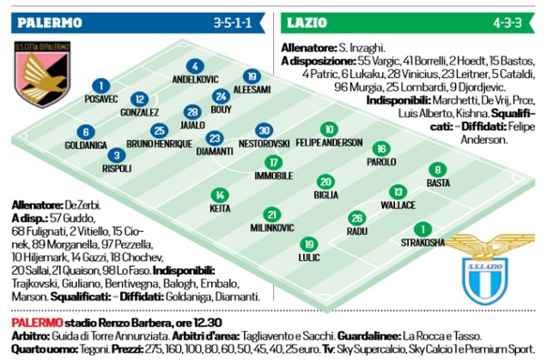 Corriere dello Sport: le probabili formazioni di Palermo-Lazio