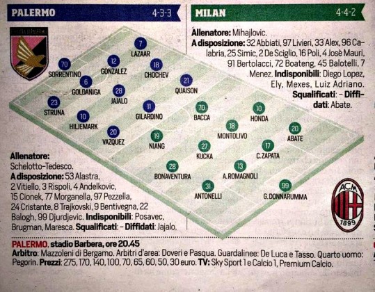Corriere dello Sport: le probabili formazioni di Palermo-Milan