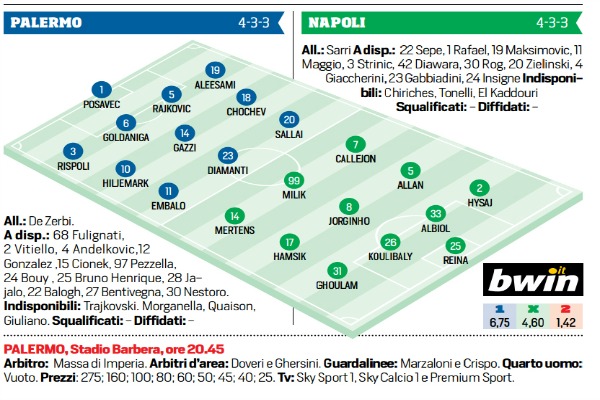 Corriere dello Sport: le probabili formazioni di Palermo-Napoli