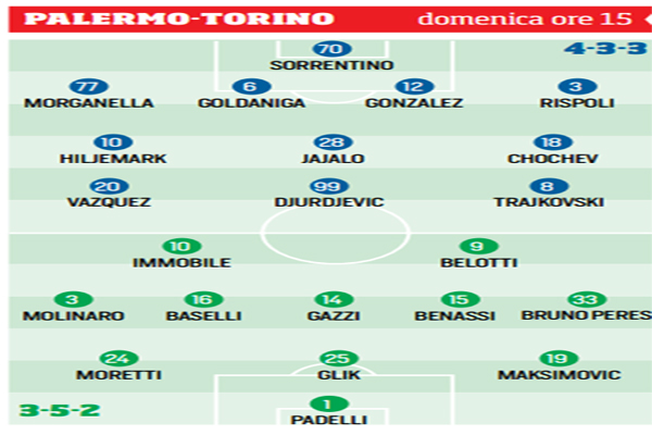 L’edizione odierna de “Il Corriere dello Sport” ha stilato le probabili formazioni di Palermo-Torino. I rosa potrebbero essere guidati in attacco nuovamente dal serbo Djurdjevic, che potrebbe avere una maglia da titolare al posto di Gilardino. Ecco come potrebbero scendere in campo le due squadre: