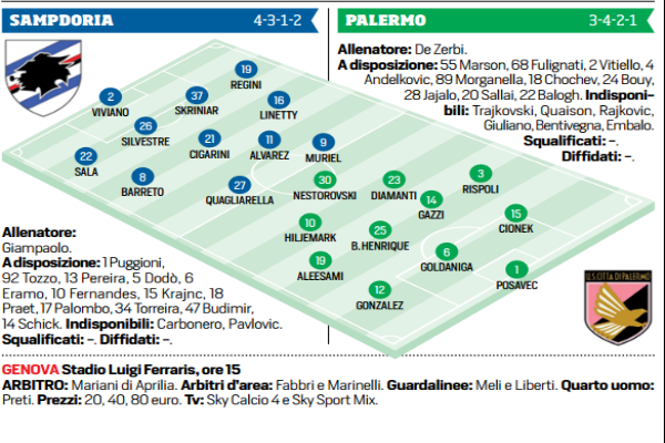 Alle 15 di questo pomeriggio al “Ferraris” andrà in scena Sampdoria-Palermo. Il tecnico rosanero, Roberto De Zerbi dovrebbe confermare il suo 3-4-1-2 visto nelle ultime uscite. Posavec tra i pali; difesa a tre composta da Cionek, Goldaniga e Gonzalez; in mediana Rispoli e Aleesami larghi, con Gazzi e Bruno Henrique centrali; in avanti Diamanti e Hiljemark a supporto di Nestorovski. Ecco in basso la foto delle probabili formazioni de “Il Corriere dello Sport”: