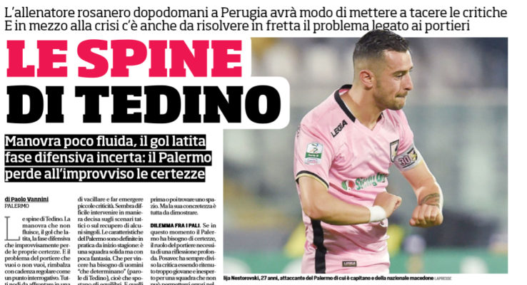 L’edizione odierna del “Corriere dello Sport”, riporta le situazioni, e successivamente le possibili soluzioni, che il tecnico del Palermo Bruno Tedino deve studiare in vista del match di sabato contro il Perugia: “Le spine di Tedino. La manovra che non fluisce, il gol che latita, la fase difensiva che improvvisamente perde le proprie certezze. E il problema del portiere che vuoi o non vuoi, rimbalza con cadenza regolare come un punto interrogativo. Tutti nodi da affrontare in una settimana caldissima ma fortunatamente breve, visto che già dopodomani si scenderà in campo a Perugia. Nelle crisi, meglio tornare a giocare il più velocemente possibile piuttosto che aumentare la tensione macerandosi nell’attesa.