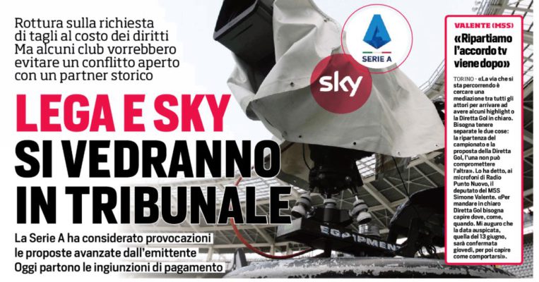 L’edizione odierna del “Corriere dello Sport” parla della diatriba in corso tra la Lega e Sky. Sono pronte a partire le ingiunzioni per il pagamento della rata dei diritti tv. Le rate avrebbero dovuto essere saldate ai primi di maggio – scrive il quotidiano -. Sky rappresenta anche un ostacolo per il progetto del ministro Spadafora di trasmettere in chiaro la “Diretta gol”, come accaduto in Germania per le prime due giornate della ripresa.