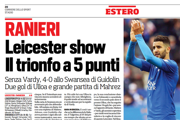 Corriere dello Sport: “Leicester show, il trionfo a 5 punti. Senza Vardy, 4-0 allo Swansea di Guidolin. Due gol di Ulloa e grande partita di Mahrez”