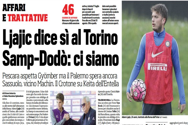 “Alla fine s’è convinto, messo alle strette dall’ultimatum della Roma: Adem Ljajic (24) andrà al Torino, alle condizioni che il club di Cairo e quello giallorosso avevano già concordato da tempo, e cioè 8 milioni di euro circa, con un quadriennale al giocatore. La Roma gli aveva imposto di prendere una decisione entro ieri, facendogli presente che, in caso di permanenza in giallorosso, non sarebbe partito titolare. Con lui in granata anche Iago Falque (26), prestito con diritto di riscatto. Samp e Genoa. Il brasiliano Dodò (24) non è partito con l’Inter per gli Stati Uniti, è il segnale che la Sampdoria attendeva: per il ritorno del laterale mancino in blucerchiato, infatti, mancava solo il sì del giocatore. I due club sono già d’accordo da tempo: prestito con obbligo di riscatto e percentuale sulla futura rivendita del difensore. Già domani l’operazione potrebbe essere definita. La Samp si concentrerà così sul centrocampo. Per Federico Viviani (24) c’è da alzare l’offerta già presentata al Verona, che chiedeva 8 milioni di euro circa: a 6 si potrebbe chiudere. L’altra pista conduce a Luca Cigarini (30), sul cui futuro l’Atalanta non s’è ancora pronunciata: piace anche al Cagliari, era un’idea per il Bologna senza dimenticare il Palermo. Santiago Gentiletti (31) è arrivato ieri sera nel ritiro rossoblù di Neustift. Ora tocca a Blerim Dzemaili (30) che risolverà il contratto con il Galatasaray e tornerà al Genoa firmando un biennale. In attacco domani Genoa e Atalanta dovrebbero parlare di Mauricio Pinilla (32). Punto Crotone. Ufficializzati gli arrivi di Mario Sampirisi (23), che ha rescisso con il Vicenza e ha firmato un triennale, e di Aleksandar Tonev (26), svincolato dal Frosinone, che ha firmato sempre per tre anni. Definito il rinnovo triennale per Adrian Stoian (25). A sinistra riprende quota Cheick Keita (20) dell’Entella. Toledo in viola. La Fiorentina accelera per Sven Van Beek (21) del Feyenoord e lavora per chiudere anche il ritorno di Cristian Tello (24) dal Barcellona, questa volta in prestito con obbligo di riscatto. Presentato Ianis Hagi (17), figlio d’arte: «Mi piacerebbe prendere da mio padre tutte le caratteristiche». E già domani potrebbe arrivare in città Hernan Toledo (17) del Velez Sarsfield, esterno offensivo: prestito di un anno. Pescara sceglie. Oddo aspetta Norbert Gyömber (24) in prestito dalla Roma (il Palermo spera ancora, ma il Pescara è in vantaggio); sfuma Ondrej Duda (21) che il club di Sebastiani ha provato a fare insieme a una big (Inter o Roma), visto che lo slovacco sta per andare all’Hertha Berlino. Altre operazioni. Il Siviglia ha finalmente annunciato l’acquisto di Franco Vazquez (27) dal Palermo per 15 milioni con bonus. Cinque anni di contratto al Mudo, che ha raggiunto la squadra negli Stati Uniti, a Orlando in Florida. E sempre ieri il Siviglia ha ufficializzato anche anche l’acquisto di Ganso (26) dal San Paolo per 10 milioni di euro. José Machin (19) della Roma è a un passo dal Sassuolo. Il Napoli ha ufficializzato Emanuele Giaccherini (31) dal Sunderland: blitz a Dimaro del giocatore che si aggregherà però dopo una settimana di vacanze. Preso Davide Santon (25) dall’Inter: 5,5 milioni, 5 anni di contratto. Samuele Longo (24), lo scorso anno in prestito al Frosinone, passa dall’Inter al Girona sempre a titolo temporaneo. Juan Camilo Zuniga (30) al Watford di Mazzarri in prestito dal Napoli è ora un affare chiuso. Mariano Andujar (32) diventa dell’Estudiantes a titolo definitivo: firma un triennale. L’Udinese cede Guilherme (25) al Deportivo La Coruña in prestito con opzione di riscatto. Questo ciò che si legge sull’edizione odierna de “Il Corriere dello Sport”.