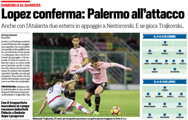 Corriere dello Sport: “Lopez conferma: Palermo all’attacco. Anche con l’Atalanta due esterni in appoggio a Nestorovski. E se gioca Trajkovski…”