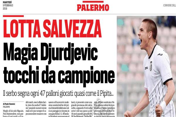 L’edizione odierna de “Il Corriere dello Sport” elogia Uros Djurdjevic, l’uomo del 2-2 che domenica ha salvato il Palermo da una sconfitta beffarda e che detiene una statistica particolare. Di seguito quanto scrive il quotidiano: “Meglio di lui solo Higuain, non fraintendete, non parliamo di reti totali, ma di una statistica che può dare indicazioni importanti. Uros Djurdjevic segna un gol ogni 47 palloni toccati, in questa speciale classifica che considera almeno 90 tocchi e dunque gioca con una certa frequenza, davanti a lui c’è solo Higuain, capocannoniere del campionato che fa un gol ogni 42 tocchi della sfera. Di certo Djurdjevic si è giocato la sua chance, perché sostituire Gilardino non è affatto facile […]”.