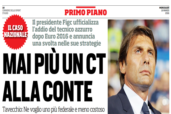 Corriere dello Sport: “Mai più un c.t. alla Conte, Tavecchio: «Ne voglio uno più federale e meno costoso»”