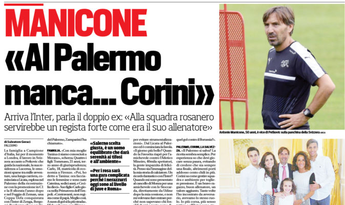 Corriere dello Sport: “Manicone: «Al Palermo manca…Corini». Arriva l’Inter, parla il doppio ex: «Alla squadra rosanero servirebbe un regista forte come era il suo allenatore»”