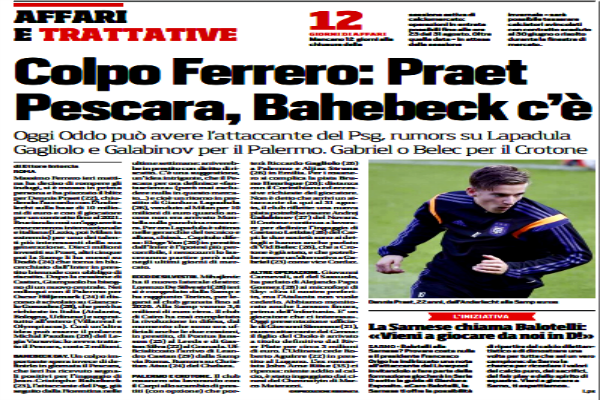 “Massimo Ferrero ieri mattina ha deciso di rompere gli indugi, si è mosso in prima persona e ha piazzato il blitz per Dennis Praet (22), chiudendo l’accordo con l’Anderlecht sulla base di 10 milioni di euro e con il giocatore per un contratto fino al 2021. Bruciando così un’agguerrita concorrenza internazionale e italiana (Lazio, poi Milan in extremis) per uno dei talenti più interessanti della sua generazione. Dieci milioni investiti su Praet, altri cinque poi la Samp li ha messi su Dodò (24) che torna in blucerchiato dall’Inter in prestito biennale con obbligo di riscatto. Dopo la cessione di Castan, Giampaolo ha bisogno di un nuovo centrale. Nei colloqui con il Palermo per Oscar Hiljemark (24) il discorso è scivolato su Giancarlo Gonzalez (28), che però ha richieste in Italia (Atalanta, Bologna, Udinese) e soprattutto all’estero (Villarreal e Olympiacos). Così un’altra idea può essere il polacco Michal Pazdan (28) del Legia Varsavia: lo aveva trattato il Pescara, costa 2 milioni. BaheBeck day.Un colpo importante spera invece di definirlo in giornata il Pescara, che ieri ha ricevuto segnali positivi per l’ingaggio di Jean-Cristophe Bahebeck (23), l’attaccante del Psg, già seguito dalla Fiorentina nelle ultime settimane: arriverebbe in prestito con diritto di riscatto. C’è una suggestione, un’idea intrigante, che il Pescara per ora definisce «fantascienza» (però mai escludere nulla in questo mercato…) e cioè un ritorno in prestito di Gianluca Lapadula (26), venduto al Milan per 10 milioni di euro quando ancora non era arrivato Montella sulla panchina rossonera. Per ora Lapadula è ultimo nelle gerarchie del tecnico e allora, chissà… Capitolo difesa: ElogeYao (20) in prestito dall’Inter è l’ipotesi più percorribile, i nerazzurri lo lasceranno partire però solo negli ultimi giorni di mercato. ecco de SilveStri. Mihajlovic ha il nuovo laterale destro: Lorenzo De Silvestri (28) ieri si è congedato dalla Samp e ha raggiunto Torino, per legarsi al club granata fino al 2020. Alla Samp vanno 3,6 milioni di euro circa. Il club di Cairo ha così completato la rivoluzione in difesa, dal momento che sono ora ufficiali anche le due cessioni, in prestito, di Pontus Jansson (25) al Leeds e di Gaston Silva (22) al Granada. Ufficializzato l’arrivo di Leandro Castan (29) dalla Samp via Roma. Rumors su Christian Atsu (24) del Chelsea. Palermo e crotone. Il club rosanero sta lavorando con il Carpi allo scambio di prestiti (con opzione) che porterà Riccardo Gagliolo (26) a Palermo e Aljiaz Struna (26) in Emilia. Per i rosanero si complica la pista Bruno Henrique (26): distanza con il Corinthians ed eccessive richieste del giocatore. Non è detto che arrivi un attaccante da qui al 31 agosto, il club riflette: una nuova pista potrebbe essere Andrej Galabinov (27) del Novara. Il Crotone continua a lavorare per definire l’ingaggio di Gaetano Letizia (26) del Carpi: le due società sono ai dettagli e hanno anche parlato di Vid Belec (26), che a Crotone è già stato, e che potrebbe essere un’alternativa aGabriel (23) come vice Cordaz. altre oPerazioni.Giovanni Carnevali, ad del Sassuolo, ha parlato di Alejando Papu Gomez (28) ai microfoni di Sky: «Era il nostro preferito, ma l’Atalanta non vuole cederlo. Abbiamo monitorato anche Larsson finora, prima dell’infortunio. E’ un giocatore che ci interessa». Oggi presentazione ufficiale di Giovanni Simeone (21), nuovo attaccante del Genoa: il figlio del Cholo è arrivato a titolo definitivo dal River Plate per circa 3 milioni di euro. L’Udinese cede Roberto Aguirre (22) in prestito al Lugano. L’ex romanista John Arne Riise (35) ci ripensa: niente addio al calcio, è stato ingaggiato dai cinesi del Chennaiyin di Marco Materazzi“. Questo quanto riporta l’edizione odierna del “Corriere dello Sport”.