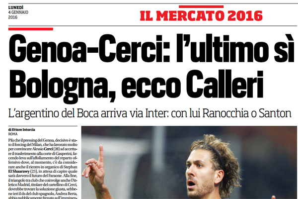 L’edizione odierna de “Il Corriere dello Sport” fa il punto sulle trattative che vedono protagoniste le squadre di serie A: “Più che il pressing del Genoa, decisivo è stato il forcing del Milan, che ha lavorato molto per convincere Alessio Cerci (28) ad accettare il trasferimento alla corte di Gasperini, facendo leva sull’affollamento del reparto offensivo dove, al momento, c’è da considerare anche il rientro in organico di Stephan El Shaarawy (23), in attesa di capire quale sarà davvero il futuro del Faraone. Alla fine, il triangolo tra club che coinvolge anche l’Atletico Madrid, titolare del cartellino di Cerci, dovrebbe trovare la soluzione giusta, sebbene ieri il ds del club spagnolo, Andrea Berta, abbia pubblicamente frenato sull’imminente chiusura dell’affare («Il giocatore è del Milan fino a giugno e se la società di Preziosi lo vuole deve comprarlo», ha detto a calciomercato.it). La realtà è che manca solo l’ultimo tassello, il sì del giocatore, atteso nelle prossime ore. In ogni caso, non in tempo per il derby con la Sampdoria che invece vorrebbe presentarsi con Ricky Alvarez (27) tra i convocati, transfer internazionale permettendo. RANOCCHIA E CALLERI. Ieri sera a Milano nuovo incontro tra l’Inter e il Bologna per definire una doppia operazione: il prestito di Andrea Ranocchia (27) ai rossoblù e l’ingaggio di Jonathan Calleri (22) del Boca Juniors, che l’Inter non può tesserare perché extracomunitario e che dunque parcheggerà per i primi sei mesi in Emilia. Il ds rossoblù Corvino ha già l’accordo con l’argentino, tocca all’Inter definire ora gli ultimi dettagli. C’è anche da fare passi in avanti sulla copertura dello stipendio di Ranocchia, fuori dalla portata del Bologna: ecco perché si è parlato anche di Davide Santon (25). Se l’Inter dovesse fare uscire Ranocchia (o Santon) e Nemanja Vidic (34), potrebbe muoversi per prendere un altro difensore, magari in Italia per colmare in lista l’uscita di un italiano. Rumors su Armando Izzo (23) del Genoa, da prendere in prestito per poi riparlarne più avanti: si è mosso già il Milan, lo sta seguendo anche la Roma. Andrebbe a coprire più posizioni in difesa, potendo giocare sia a destra che a sinistra nella linea a tre o come esterno a quattro. Sempre a proposito di Inter, voci dalla Turchia su un possibile tentativo del Fenerbahçe per Fredy Guarin (29). ALTRE OPERAZIONI. Un nome nuovo per l’Atalanta: è l’albanese Shkelzen Gashi (27) del Basilea, ala sinistra con passaporto svizzero, un profilo che ricorda molto Maxi Moralez (28), ceduto al Leon e ancora da sostituire in rosa. Si riflette su Sam Larsson (22) dell’Heerenveen, anche lui un mancino. L’Udinese ha chiesto Simone Padoin (31), che è in scadenza, alla Juve, e tratta il giovane trequartista Andrija Balic (18) dell’Hajduk Spalato. Il Verona oggi presenterà Urby Emanuelson (29), svincolatosi la scorsa estate dall’Atalanta, e valuta per il centrocampo Matteo Brighi (34). Il Chievo insiste su Isaac Cuenca (24) del Bursaspor. La Samp segue la pista Dodò (23): l’interista ha bisogno di giocare dopo l’infortunio. Sergio Floccari (34) e Antonio Floro Flores (32) piacciono al Frosinone, che tiene viva anche la pista Marcello Trotta (22). Floro Flores piace anche al Palermo: in caso di uscita di uno o di entrambi gli attaccanti, il Sassuolo pensa ad Alberto Paloschi (25). Il Carpi cerca un portiere: Gabriel (23) o Rafael (25), entrambi al Napoli, ma il primo (ex Carpi) in prestito dal Milan. A centrocampo sfida al Verona per Marco D’Alessandro (24) dell’Atalanta, club con il quale si proverà ad allargare il discorso a Gaetano Monachello (21). Il Carpi però ha già in mano Matteo Mancosu (31) che il Bologna farà partire non appena avrà definito l’ingaggio di Calleri”.