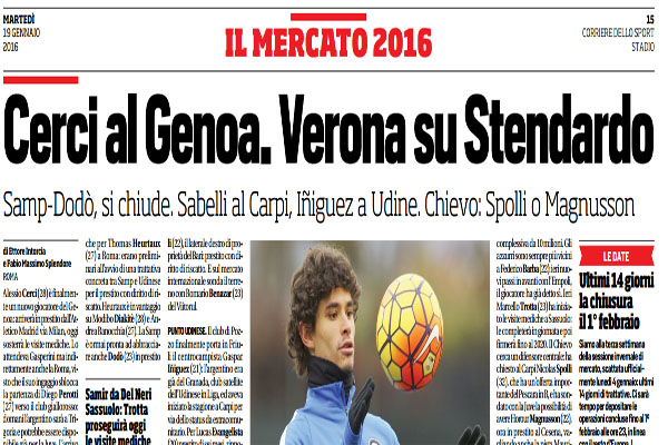 Alessio Cerci (28) è finalmente un nuovo giocatore del Genoa: arriverà in prestito dall’Atletico Madrid via Milan, oggi sosterrà le visite mediche. Lo attendeva Gasperini ma indirettamente anche la Roma, visto che il suo ingaggio sblocca la partenza di Diego Perotti (27) verso il club giallorosso: domani l’argentino sarà a Trigoria e potrebbe essere disponibile già per la Juve. L’arrivo di Cerci non necessariamente preclude la strada all’approdo di Giuseppe Rossi (28) in rossoblù, anche se la priorità per la Fiorentina (e per il ragazzo stesso) è che Pepito possa andare a giocare con continuità. Il club viola attende un’offerta formale, sul giocatore anche Verona, Levante e Olympiacos. Difesa Samp. Ieri visite mediche per Thomas Heurtaux (27) a Roma: erano preliminari all’avvio di una trattativa concreta tra Samp e Udinese per il prestito con diritto di riscatto. Heurtaux è in vantaggio su Modibo Diakitè (28) e Andrea Ranocchia (27). La Samp è ormai pronta ad abbracciare anche Dodò (23) in prestito dall’Inter: il giocatore ha dato la disponibilità, oggi il club di Ferrero aspetta la conferma per fissare le visite mediche. L’alternativa è Gabriel Silva (24) dell’Udinese, ora in prestito a Carpi. Mosse Carpi. La matricola emiliana chiude per Stefano Sabelli (22), il laterale destro di proprietà del Bari: prestito con diritto di riscatto. E sul mercato internazionale sonda il terreno con Romario Benazar (23) del Viitorul. Punto Udinese. Il club di Pozzo finalmente porta in Friuli il centrocampista Gaspar Iñiguez (21): l’argentino era già del Granada, club satellite dell’Udinese in Liga, ed aveva iniziato la stagione a Carpi per via dello status da extracomunitario. Per Lucas Evangelista (20) prestito di sei mesi, rinnovabile, al Panathinaikos di Stramaccioni. L’ex romanista Marquinho (29) va in prestito all’AlAhli, mentre il difensore Samir (21), ex Flamengo, va in prestito per 18 mesi al Verona. Altre operazioni. Senad Lulic (29) ha rinnovato con la Lazio fino al 2020. Per Alberto Grassi (20) il Napoli sorpassa decisamente la Fiorentina: offerta complessiva da 10 milioni. Gli azzurri sono sempre più vicini a Federico Barba (22): ieri nuovi passi in avanti con l’Empoli, il giocatore ha già detto sì. Ieri Marcello Trotta (23) ha iniziato le visite mediche a Sassuolo: le completerà in giornata e poi firmerà fino al 2020. Il Chievo cerca un difensore centrale: ha chiesto al Carpi Nicolas Spolli (32), che ha un’offerta importante del Pescara in B, e ha sondato con la Juve la possibilità di avere Horour Magnusson (22), ora in prestito al Cesena, vagliando anche la pista Maurizio Domizzi (35) dell’Udinese. Anche il Verona cerca un centrale difensivo e idea è Guglielmo Stendardo (34), che potrebbe dire addio all’Atalanta. I bergamaschi hanno ufficializzato ieri Berat Djimsiti (22), la Fiorentina il prestito di Marko Bakic (22) al Belenenses. Jonathan De Guzman (28) è a un passo dallo Swansea”. Questo quanto si legge sull’edizione odierna de “Il Corriere dello Sport”.
