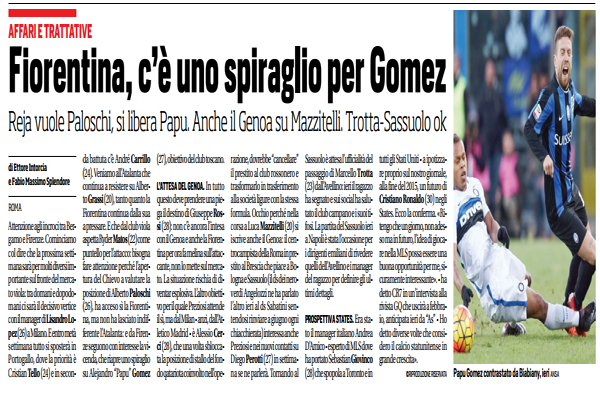 Corriere dello Sport, mercato serie A: “Fiorentina, c’è uno spiraglio per Gomez. Reja vuole Paloschi, si libera Papu. Anche il Genoa su Mazzitelli – tutte le trattative in corso”