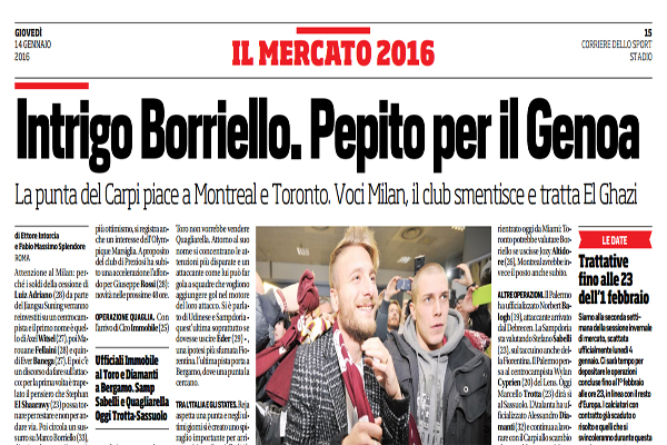 Corriere dello Sport, mercato serie A: “Intrigo Borriello, Pepito per il Genoa – tutte le trattative del giorno”