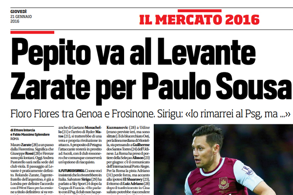 Corriere dello Sport, mercato serie A: “Pepito va al Levante, ecco Zarate per Sousa. Floro Flores tra Genoa e Frosinone. Sirigu: «Io rimarrei al Psg, ma…» – le trattative di giornata”